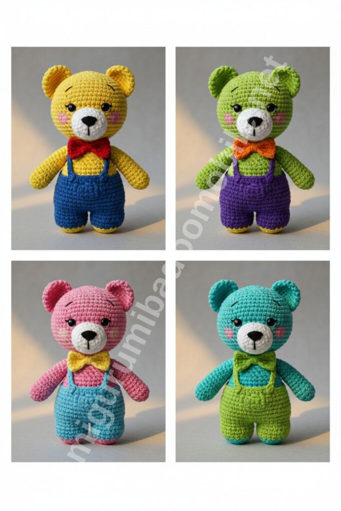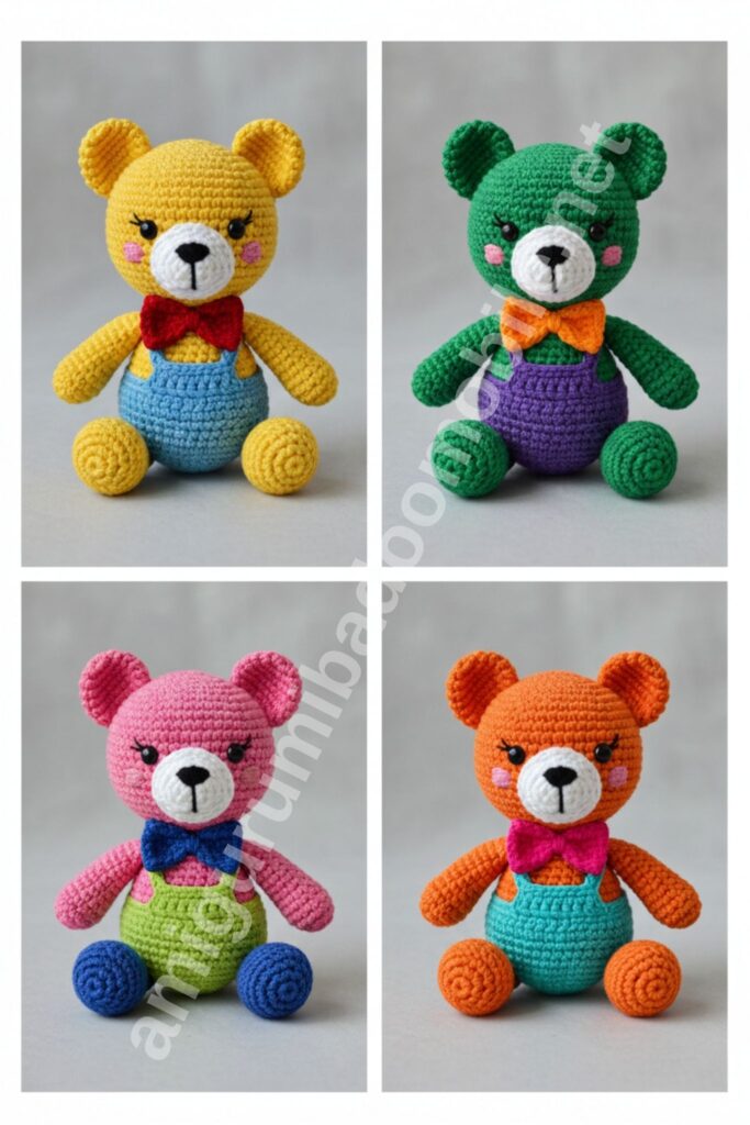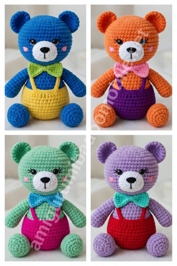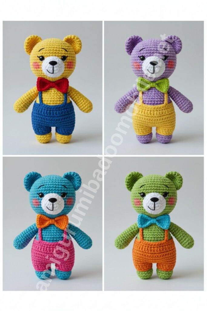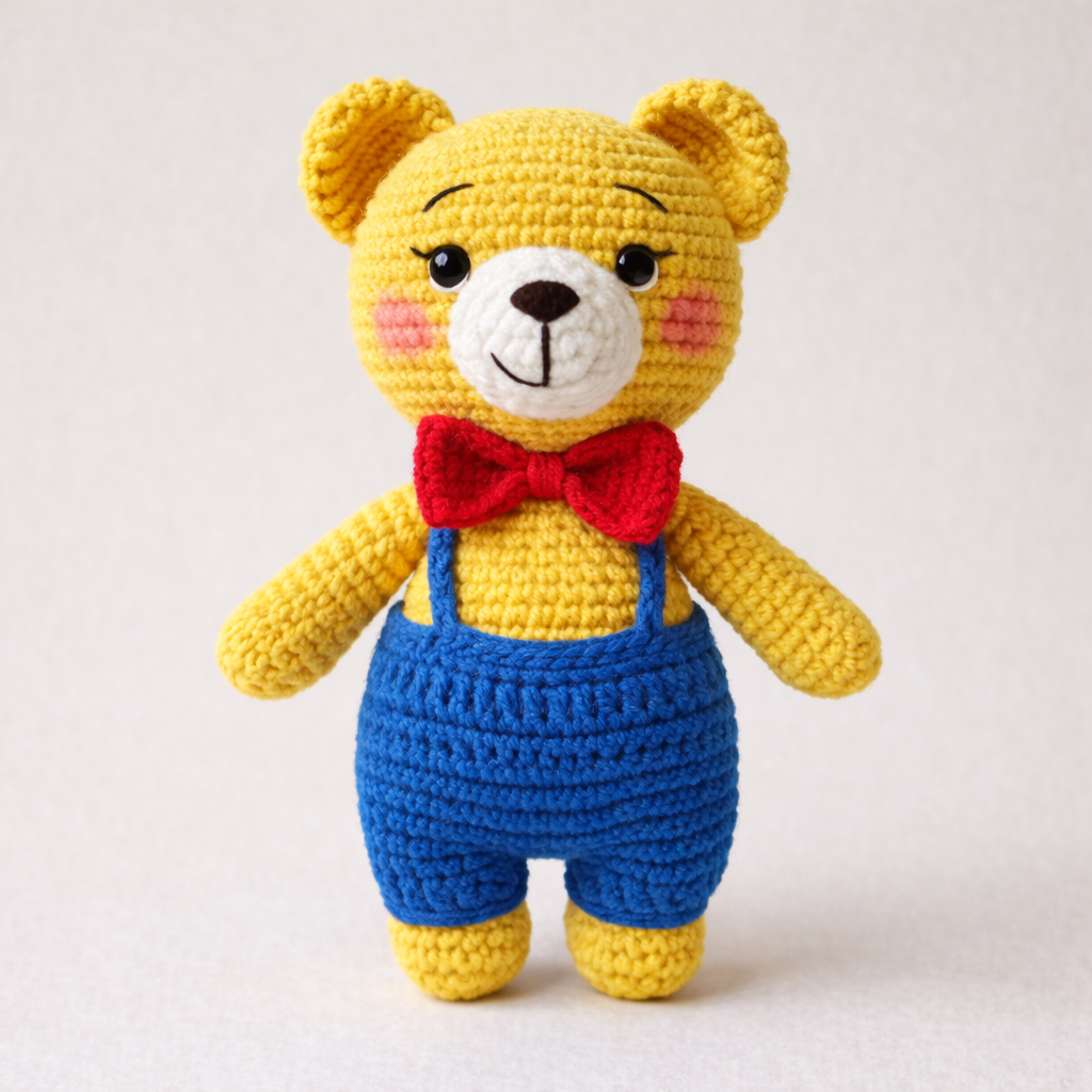 This classic teddy bear amigurumi is designed with a standing pose, chubby proportions, and a cute bow tie. Perfect for kids, gifts, or colorful crochet collections.