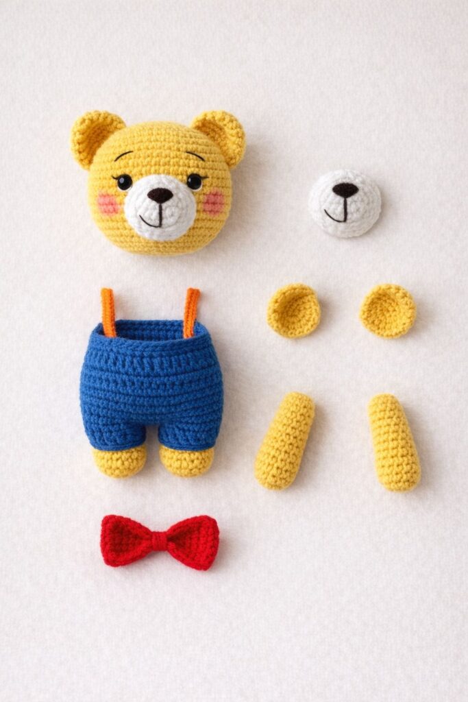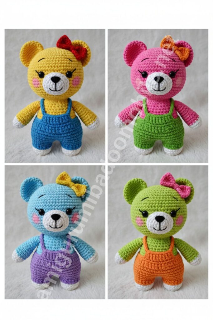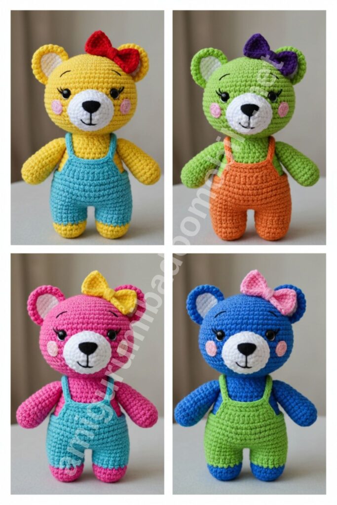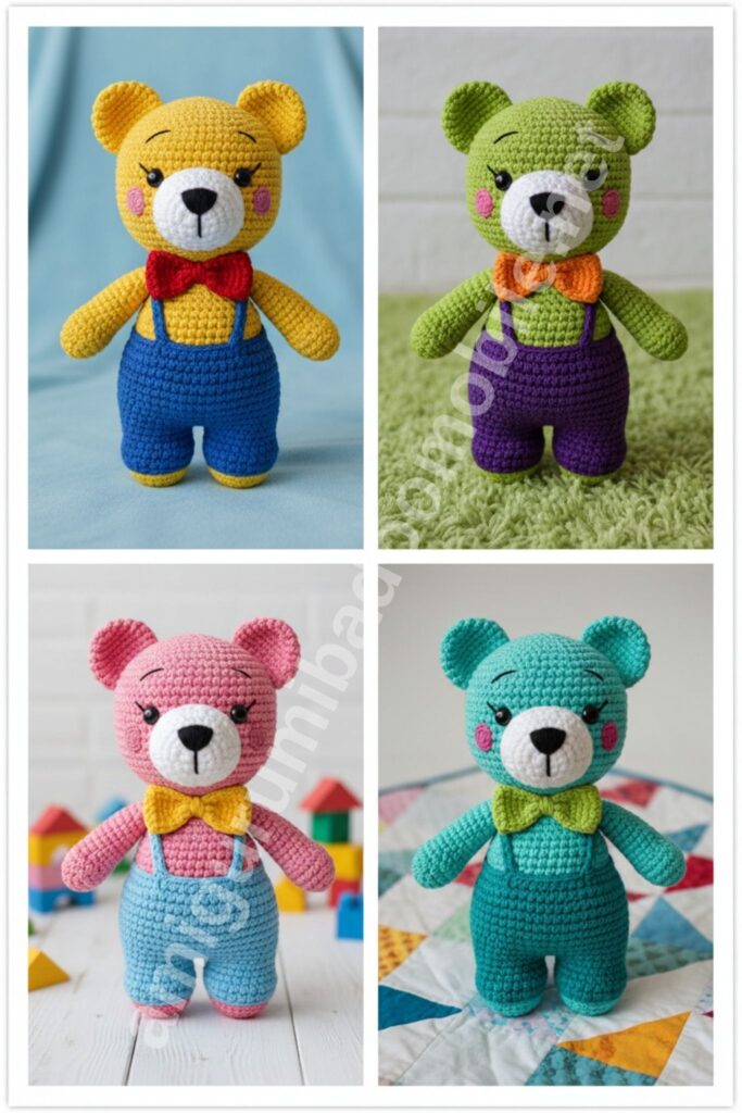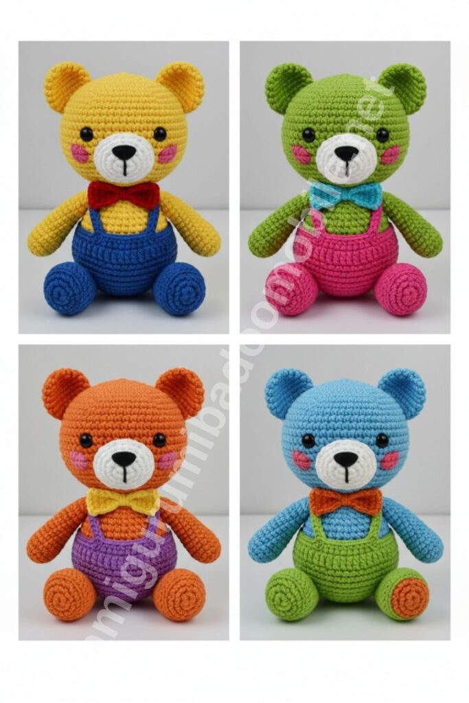 This classic teddy bear amigurumi is designed with a standing pose, chubby proportions, and a cute bow tie. Perfect for kids, gifts, or colorful crochet collections.